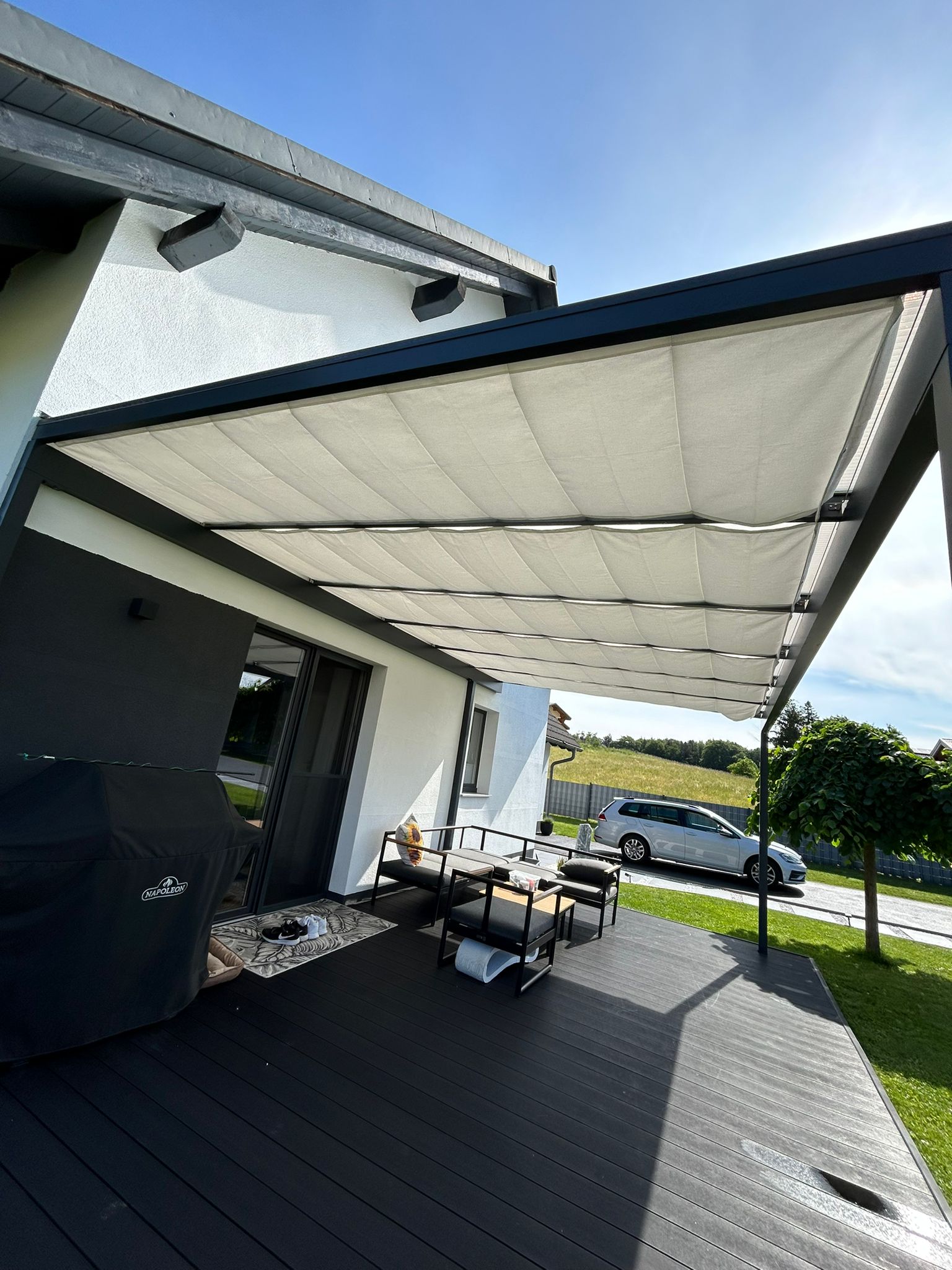 Egal ob Sie ein Holz, Aluminium oder Stahl Terrassendach/ Pergola oder einen Wintergarten haben. Unsere für Sie Maßgeschneiderten Seilspannmarkisen