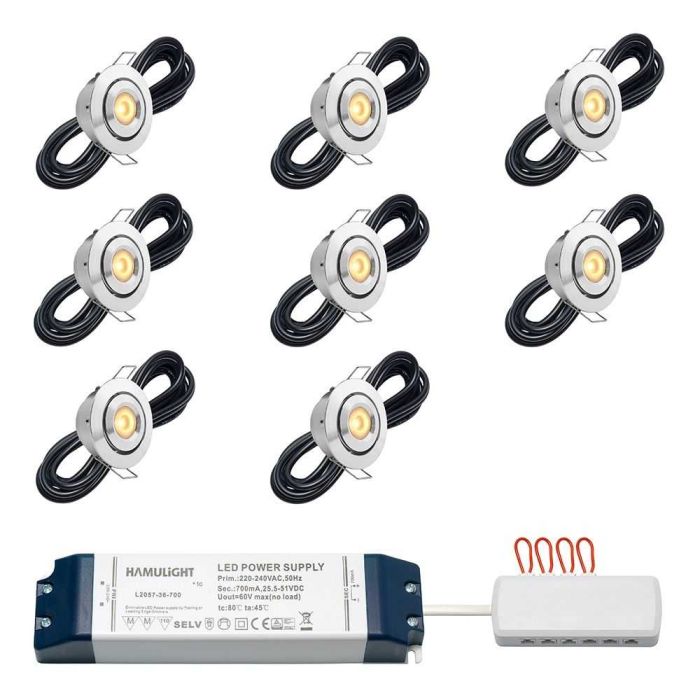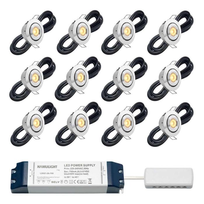 Dieses BAS-Set mit stilvollen Cree-LED-Einbaustrahler aus der Toledo-Serie ist speziell für Überdachungen konzipiert. Das Toledo BAS-Set ist mit 4, 6, 8, 10 oder 12 LED-Einbaustrahlern (3 Watt) mit einen in Reihe geschalteten LED-Transformator mit Verteiler. Die eingebauten Strahler sind dimmbar und kippbar. Dieses Set ist für Holz- und Aluminiumüberdachungen geeignet.