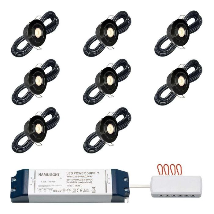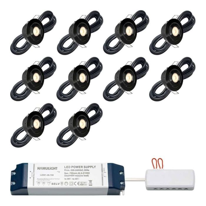 Dieses BAS-Set mit stilvollen Cree-LED-Einbaustrahler aus der Toledo-Serie ist speziell für Überdachungen konzipiert. Das Toledo BAS-Set ist mit 4, 6, 8, 10 oder 12 LED-Einbaustrahlern (3 Watt) mit einen in Reihe geschalteten LED-Transformator mit Verteiler. Die eingebauten Strahler sind dimmbar und kippbar. Dieses Set ist für Holz- und Aluminiumüberdachungen geeignet.