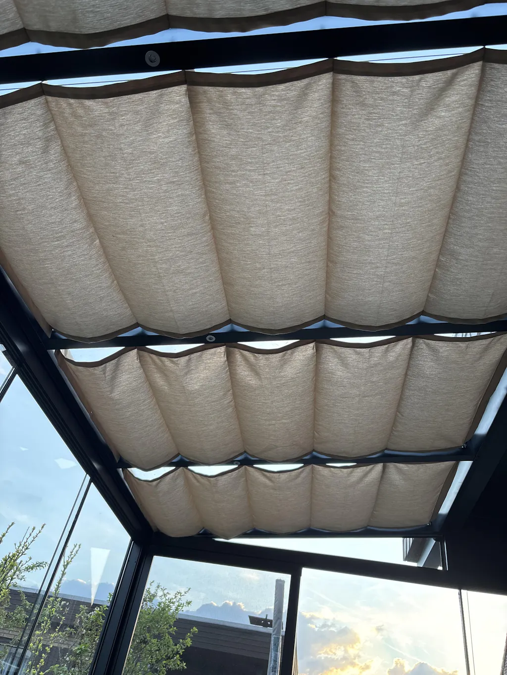 Da diese Dächer meist flache Sparren von ca. 10 cm Höhe haben, besteht bei zu viel Stoff das Risiko, dass die Wellen unter die Sparrenkante hängen. In diesem Fall kann seitlich Sonnenlicht durchscheinen – und genau das möchte man mit einem Sonnenschutz ja vermeiden.